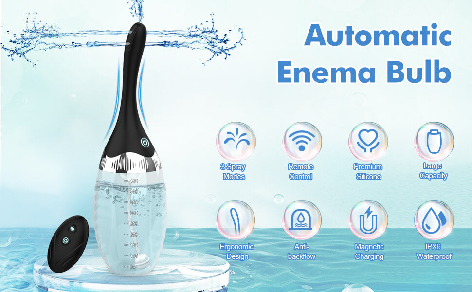 I purchased this automatic enema bulb to replace one of those inexpensive rubber squeeze bottles with the weird 4-sided nozzle. That old squeeze bottle was uncomfortable to insert and was very messy to use. This automatic enema bulb is a total dream. First of all, the insertion nozzle is smooth and easy to get in with just a little lube. But the real benefit is the automatic remote-driven pumping. You simply let it automatically pump in as much fluid as you want or need, and then use the remote to click it back off. There are three speeds you can use on the pump, and a sort of turbo-mode. It's remarkably simple, effective, and also has anti-backflow valves to insure that nothing migrates back into the bottle. Easy to use, easy to clean up, and very effective. Highly recommended.